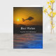 Grattis på pension, pappersgratulationskort med en dramatisk scen av en helikopter som flyger över vatten med kullar i bakgrunden. Solen tittar fram genom en disig himmel. Anpassa texten på omslaget och insidan efter önskemål. Konst, bild och vers copyright © Shoaff Ballanger Studios, 2022.