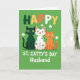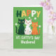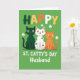 Det här kortet visar tre stiliserade katter som ligger på rad över en djup smaragdgrön bakgrund, deras kroppar arrangerade i en stadig horisontell rad som känns nära och mysig 💚. Till vänster sitter en skoggrön katt med skarpa gula ögon, lutad något mot mitten som om den umgås med de andra. I mitten är en vit katt prydd med små shamrock-former, och dess lugna ansikte verkar möta den vänstra kattens blick på ett tyst tillgiven sätt ☘️. Till höger fullbordar en orange katt trion med ett mjukt leende som matchar gruppens vänliga stämning. Vita shamrockar svävar runt dem som lätt konfetti och fyller utrymmet utan att tränga katterna. Nära toppen syns “HAPPY” i rundade bokstäver, omväxlande ljust grön, orange och vit över ordet. Längst ner