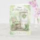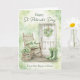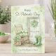 Fira St. Patrick's Day med hjärtlig charm och mysig stugvärme. Detta vattenfärgskort har en välkomnande irländsk stugveranda dekorerad med en shamrockkrans, gungstol, gröna stövlar och mjuk vårgrönska - en mysig scen som fångar andan av hem och tradition.