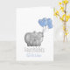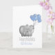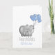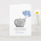 Personlig grattis pojke kort som visar en elefant med blå ballonger. Namn i det nya morsa och pappa, födelseåret och det inre budskapet kan anpassas. Den här söta och illustrerade designen är perfekt för nya föräldrar.