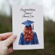 Detta söta examenskort har en rödhårig kvinna i kunglig blå klänning. Personifiera med studentens namn och klassinformation. Insidan är medvetet lämnad tom så att du kan skriva ett personligt meddelande. Beställ din nu!