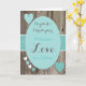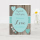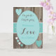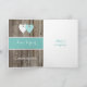 Anpassa denna rustika, mörka *träd effekt bakgrund, med vita och turkosa hjärtan, Bröllopskort till bruden och brudgummen, med deras namn.
