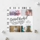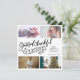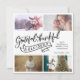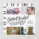 Familjefotosamlingskonstruktion Grattis, tack och lov. Blästertypografi utformar helgdagskorten för julen. Lägg till fyra av dina favoritfamiljefotografier från året, från hälsning och från namn. Julkortet går tillbaka till ett svartvitt på baksidan.