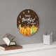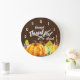 En klocka med typografitexten som säger: tacksamt tacksamt välsignat. Designad med en vattenfärgad illustration av pumpor, akorner, svamp och säsong höst löv. Brun vattenfärgsbakgrund. Art deco stil, vit klocka ansikte.