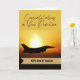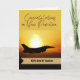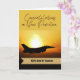 Grattis till din befordran till överstelöjtnant i flygvapnet. Pappersgratulationskort med ett fotografi av ett militärflygplan från flygvapnet mot en brinnande sol på himlen. Lägg till ett namn på det guldtonade bandet på kortets omslag. Konst, bild och vers copyright © Shoaff Ballanger Studios, 2022.