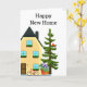 Detta gratulationskort skapades för nya husägare. Framsidan av kortet visar en illustration av ett hem med ett träd och en krukväxt. Det finns också en hälsning på insidan och en plats för namnteckning.