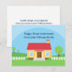 Glad hemjubileum marknadsföringkort med en söt teckning av ett hus för ett fastighetsbolag att skicka ut till kunder. Lånehandläggare och bolåneföretag kan också använda dessa kort som ett verktyg för att påminna tidigare kunder om att de kanske är redo att refinansiera eller leta efter ett nytt hus. Mäklare, glöm inte att tidigare kunder leder till nuvarande rekommendationer!