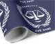 Presentpapper för juristexamen med rättvisans vågskål på marinblå bakgrund. För att anpassa för din favoritjurist, juriststudent, domare eller advokat, redigera texten för att lägga till hans eller hennes namn.