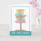 En riktningsvisare pekar vägen till en rolig och avkopplande semester. Den står på en hög med jord och är fylld med roliga semesterting. En teal färgblock visar orden “Yay för Vacay!”. Skicka önskningar om en bra tid på semester.