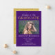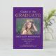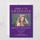 Klassisk och elegant men ändå glittrig "Grattis till vår examen" i lila och guldton med falskt glitter-examensdesign med ett foto på framsidan med orden "Grattis till vår" i ett icke-redigerbart skrivstil och ordet "EXAMEN" i falskt guldglitter. Din graduates namn, skola, klassår, examensdatum och framtida planer hamnar under fotot. Baksidan har en falsk guldglitterbakgrund. Design av Holiday Hearts Designs (rättigheter förbehållna).
