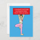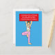 En tecknad dam som står i en yogaställning och håller upp en röd skylt med texten 'Grattis till yogaskolexamen'. Bilden har en himmelblå bakgrund.