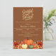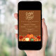 En rostfri, brun bakgrund. Dekorerad med pumpor och orange och gula blommor. Anpassa och lägg till information om party. Textskript: Lyckligt och välsignat.