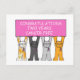 Fyra katter i tecknaden håller upp ett stort rektangulärt tecken på rosa som säger "Grattisar två år utan cancer".