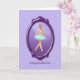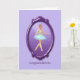 En ung ballerina med strålkastarljus på hennes baksida strejkor är en underbar attityd mot djup lila bakgrund. Hennes dräkt är vit och gult med ljus rosa trim. Den gör ett kort för underbara grattisar för en bättre prestanda i ett skäl. Den inre texten är anpassade.