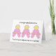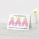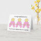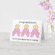 Tre identiska spädbarn när det gäller att matcha blekens rosa romper kostym, åtföljt av texten "Grattisar du är morföräldrar till triplets".
