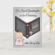 Gratulerar till er barndotter för hennes baptism med ett kort med ett vackert flicka framför en grått- och rosa bibel med röd rosary på en övertoningsbakgrund med svart text. Utformning av Laurie Schneider/Inslag av Scrappin Doodles