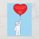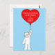En söt vit katt som står upp och håller en stor rödballong mot en blek blå bakgrund Ballongen har "Grattisar om att bli fosterförälder" skriven på den.