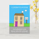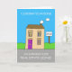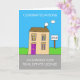 Ett tecknad hus med ett försäljningsskylt bredvid det i trädgården. Ord "Grattisar om att få ett körkort i gods" åtföljer texten.