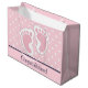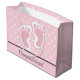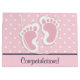 Grattisar presentsäckar med en bra bild av fotavtryck från rosa flicka med en vit kontur. Vit polka dots på en rosa bakgrund bakom illustrationen.