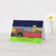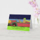 Grattisar för en bästa vän på hennes nya bil. Illustration av en återstyrd vintage med grönt- och läderinslagen ratt och däck som är fäst vid sidan. En kvinna som är klädd i kamelhår jackar, grönt och gult, och halsduk av gult. Hon kör under en stjärna fylld i himmel. Art, bild och versell copyright © Shoaff Ballanger Studios.