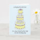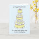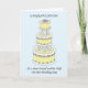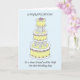 En illustration av en treskiktad pastellkaka av färgad bröllop som ställs in mot blekens blå färgad bakgrund. Bilden åtföljs av orden "Grattisar till en Bäste vän och hennes fru på deras Bröllopsdag".