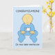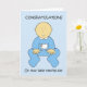 Ett sött pojke i en blå apparat, och ord "Grattisar på baby namngivningsdag".