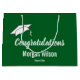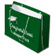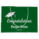 Grattis till student prestation. En vit student-sockel står ovanför manuset "Grattisar". Det finns en vit text för student namn och det år student tar examen. Bakgrunden är mörk grönt.