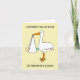 Ett enkelt exempel på en stork som håller baby i ett vitt lakan som hänger från dess näsa. Bilden har en bakgrund av färgaden citron och åtföljs av ord Grattisar om att bli kusin.