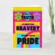 Grattisar om att komma ut på hälsningskort med ställ för sanning, ställ för braveri, ställ dig med Pride. Färgfull design ljusa färger med hjärtan, former och stor regnbåge. Fira kärlek, acceptans och mod. Art, bild och versell copyright © Shoaff Ballanger Studios, 2022.