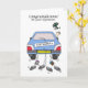 En tecknad av en söt blå färgad som har "Ny gifta" på baksidan av den. Shoes och tinmburkar är bundna till baksidan av bilen och bruden kastar ut sin bukett från ett framfönster.