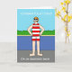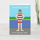 En illustration av en man med stor mustasch, som bär ett simskyddshölje och röd och vit strippad badplats. Mannen står på sjö sida med händer på sina höfter. Ord "Grattisar på simman fantastisk" följer med bilden.