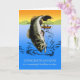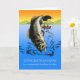 Grattisar på Pension för en svåger. Vintage fiskeplats med återträbåt, två fiskare, stora munbassänger, solnedgång och stort stänk i sjö vatten. Hazy grönt backe i den yttersta avstånd. Art, bild och versell copyright © Shoaff Ballanger Studios.