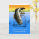 Grattisar på pension för morfar. Kort med vintage fiskecentrum för två fiskare i en båt som fångar en stor munbotten. Fisken blåser i sjö vatten och skapar vinkarare. Retro-scen med mjukt avstängt färg-schema. Solnedgång över grönt fylls backe i det övre området. Art, bild och versell copyright © Shoaff Ballanger Studios.