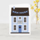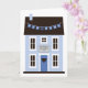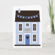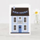 Home Sweet Home Grattiss Card | Ett modernt gratulerar på ditt nya hemkort med en enkel vektor teckning i ett blått hus, som buntar med ord "NEW HOME" och par namn på en skylt ovanför dörren.