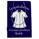 Personlig grattisar på att bli en fysioterapeutisk presentsäck. Blåsäcken visar en vit fysiouniform. Om du vill anpassa namn som visas för fysioterapin student klickar du på personanpassa. Matchningskort och kopp finns också i denna moderna utformning.