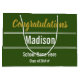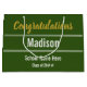 Grattisar till student! I mitten finns det en ställe för student namn i vit text. I toppen står det "Grattisar" i skriften "Faux (inte foil) guld. I grund kan du lägga till årsklassen och namn i student skola. Texten är också vit. Säcken är grönt i skogen..