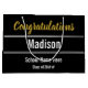 Grattisar till student! I mitten finns det en ställe för student namn i vit text. I toppen står det "Grattisar" i skriften "Faux (inte foil) guld. I grund kan du lägga till årsklassen och namn i student skola. Texten är också vit. Säcken är svart.