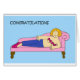 En tecknad kvinna som ljuger på en kaistisk ensamtråd med jeans och rosa skor och två rosa bågar som täcker hennes övre halva. Bilden har en pastellblå bakgrund och säger "Grattisar".