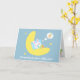 Skicka dina grattisar till nya föräldrar med det här hälsningskortet! Det har en söt liten kanin i baby som njuter av sin tupplur på måne med en blå nappar i munnen. Början är i drömland och drömmer lyckligt om morötter. Små stjärnor snurrar runt bunny. Anpassa med ditt meddelande till föräldrarna.