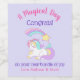 Ett flaska-märke för ett nyfödd bebis. Perfekt för alkoholfritt mousserande äppelcider eller liknande. Designad med en illustration av en söt och kawaii-enhörning som sover fredligt med en finare-lermane och svan. En färgstark regnbågsstjärna ovanför hennes huvud. Texten säger: En magisk dag. Ange på en bakgrund för pastelllila.