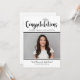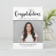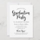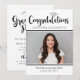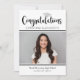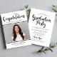 Fira din examen med denna moderna svarta och vita inbjudan till examensfest med fet stil “Gratulerar” och en silverfärgad examensmössa accent. Lägg till ett favoritfoto och anpassa namnet och skolans detaljer. Baksidan innehåller matchande “Examensfest” typografi med ren, lättläst festinformation.