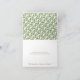 Tackkort med tema St. Patrick's Day och shamrock för bröllop med ett grönt hjärta med vita shamrocks inuti, lyckliga hästskor i guld och ett anpassningsbart banderoll som säger Tack. En krämvit pergamentliknande antikk bakgrund med ett subtilt damaskmönster ger denna irländska tacksedel en speciell touch. Denna moderna vintage-design är perfekt för ett bröllop i mars, brud-, par- eller förlovningsfirande. Insidan har ett diagonalt hjärta- och shamrockmönster. Det kan anpassas och få ett monogram med förlovnings-, brud- och brudgummonogram och initialer. Illustration © Chrissy H. Studios, LLC. Med ensamrätt
