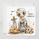 Graveyard Giggles - A Mummy’s Halloween Moment En vidögd tecknad mummy sits vid en gravestone märkt "RIP", omgiven av karvpumpor, en skalle, spritt höst löv och en kor som är inslagen i förband. Spelande fladdermus-fladder i närheten, medan den handskrivna "Happy halloween" hälsning tillför en festlig beröring. Konstruktionen blandar skokuscharm med ljust stollig, fångar Halloween-andan med värme, humor och ett streck av odödan.