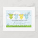 En fantastisk graviditetsannonserings vykort med en rad babykläder upphängda på ett tvättstreck i en vår- eller sommarmiljö, med gräs och fåglar. Söt modern stil. Lägg till era namn och beräknad förlossningsdatum. Mjuka pastellfärger i gult, grönt och blått.