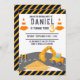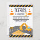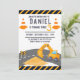 Uppförande av schaktmaskiner Kone Barns födelsedag Parte Investigation Excavator Construction Temed födelsedagsfest inbjudan med en enkel vit bakgrund, med söta tecknader av schaktmaskiner, sand, väg och kon. Detta är en modern mall för barns födelsedag firande som är lätt att anpassa och anpassa.