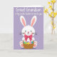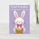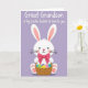This card features a stylized white rabbit sitting front and center on a pastel lavender background 🐰. Its long ears have soft pink inner details, and its round face shows small black eyes, rosy cheeks, fine whiskers, and a bright pink nose that feels sweet and welcoming. A deep pink bow at the neck adds a dressed-up touch, like it’s ready to celebrate with someone special. The rabbit holds a woven basket close between its paws, creating a cozy, caring moment as if it’s offering a gift with quiet affection 🌷. Inside the basket, patterned eggs fill the space with stripes and swirls in yellow, blue, green, and pink, bringing a springtime look without feeling crowded. At the top, white text is placed above the rabbit in two lines, reading “Great Grandson,” followed by “A big Easter basket of love to you.” The basket’s textured weave and the eggs’ tiny patterns stand out crisply against the smooth lavender backdrop.