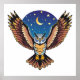 Illustration of a stylized flying owl with big eyes, and orange beak, Long-eared Owl, Great Horned owl