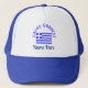 Personalized design shows the Flag of Greece and the words GREEK GODDESS above, in blue letters. Add a name underneath to personalize your trucker hat or create a customized gift. Fun for Greek-Americans, Greek Canadians, or anyone with Greek heritage, ancestry or culture. YIASSOU! The flag is blue and white stripes with a blue cross on a white background in the upper left area.