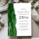 The left-hand edge of this elegant modern wedding anniversary party invitation features a green watercolor agate border trimmed with silver faux glitter. The customizable text combines charcoal gray handwriting, copperplate and italic fonts on a white background. The reverse side features a matching green and silver agate design.