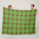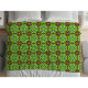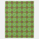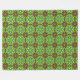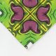 "Two images showing a vibrant green and purple geometric pattern with star motifs. The top image displays towels hanging, and the bottom shows a washcloth folded over. The design conveys a lively and decorative tone."